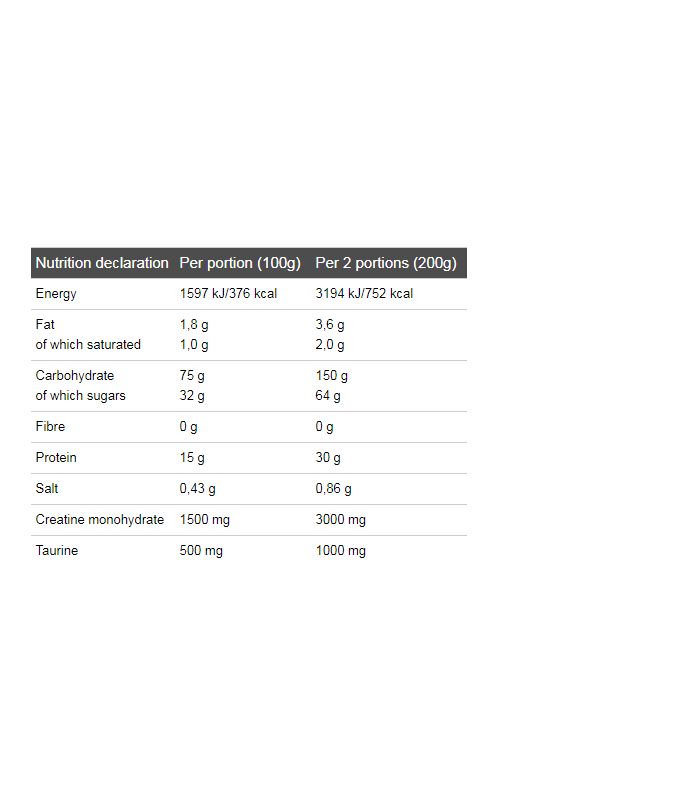 مجموعه ترکیب ارائه شده کربوهیدارت ها با مقیاس گلیسمیک متفاوت ( قند در خون) و مخلوط پروتئین، غنی شده با مونوهیدرات کراتین و تارین.
