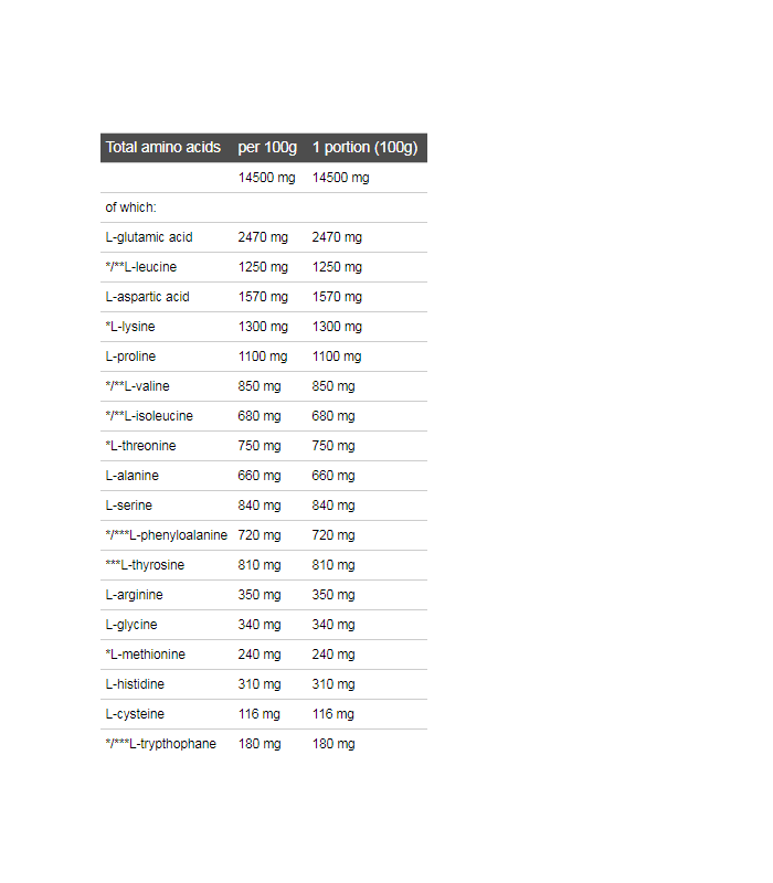 دارای انواع پروتئینها، اسیدهای آمینه EAA’s ٬ BCAA’s و گلوتامین، کراتین مونوهیدرات و تائورین