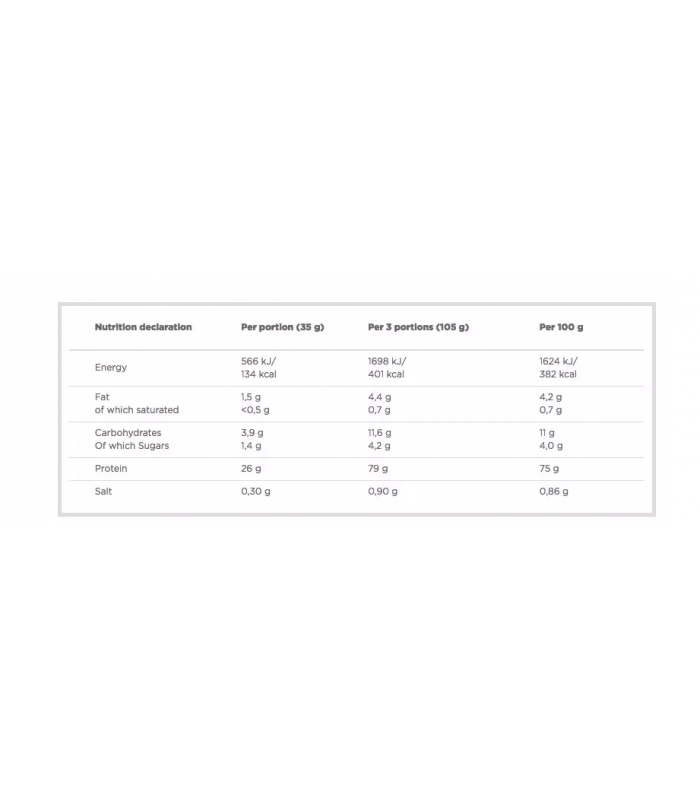 مواد تشکیل دهنده آن ۹۳.۵٪ پروتئین مخلوط (ultrafiltrated WPC کنسانتره پروتئینی آب پنیر، پروتئین آب پنیر منزوی - CFM WPI)، فروکتوز، ۱.۵٪ کاکائو کم چرب (برای شکلات، شکلات، نعناع و طعم تافی)، عطری، ۱٪ قهوه های فوری، قهوه های فوری مالت (برای طعم قهوه و کاپوچینو)، تنظیم اسیدیته - اسید مالیک، شیرین کننده - آسه سولفام K، سوکرالوز، قوام دهنده - صمغ زانتان، کلرید پتاسیم، رنگ: E 129 (توت فرنگی، توت فرنگی، موز، توت سیاه، گیلاس، تمشک طعم)، E 110 (نارنجی، چند میوه و ماست وانیل)، E 150c (تافی، قهوه، شکلات، شکلات، نعناع، ​​فندق و طعم کاپوچینو)، E 104 (موز، لیمو، ماست و لیمو طعم).